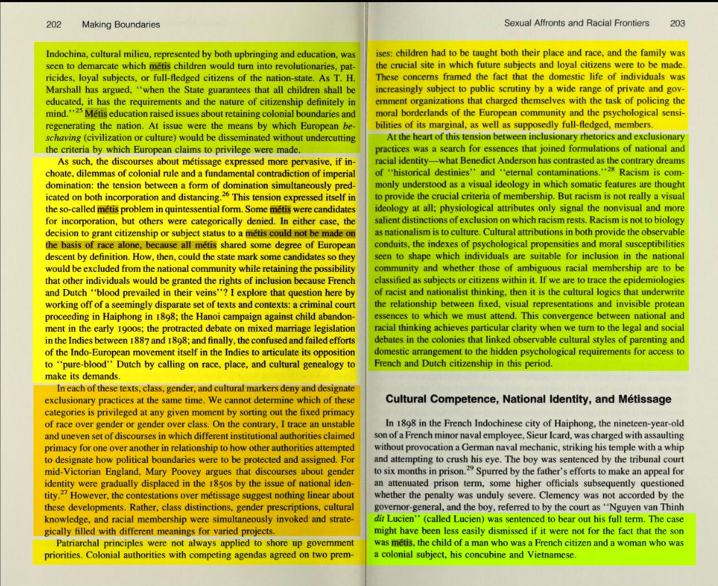 on race, place, and cultural genealogy to make its demands.) - The son was metis, the child of a man who was a French citizen and a woman who was a colonial subject, his Vietnamese concubine.