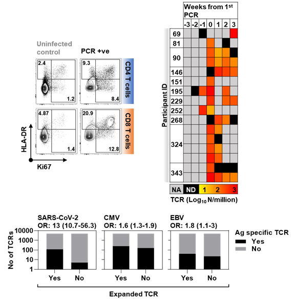 Cell proliferation was most evident in CD8 T cells and associated with rapid expansion of SARS-CoV-2 reactive TCRs.