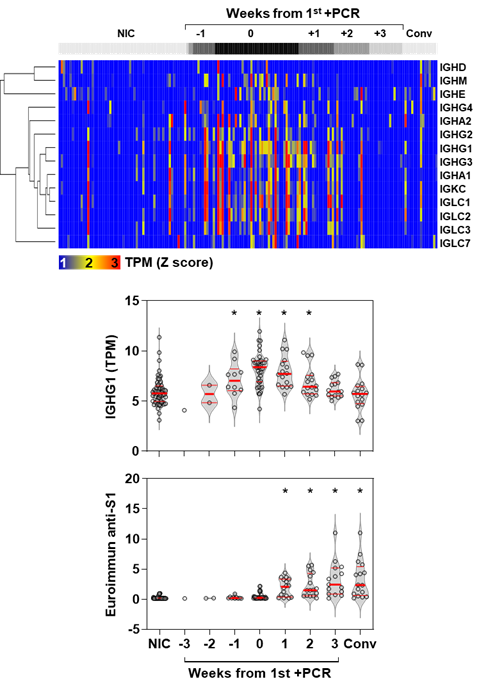 We found an equally rapid increase in immunoglobulin transcripts, but circulating virus-specific antibodies lagged by 1-2 weeks.