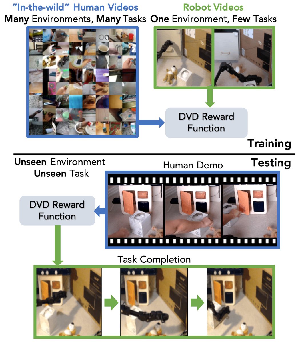 This discriminator can be used as a reward by feeding in a human video of the desired task and a video of the robot’s behavior.