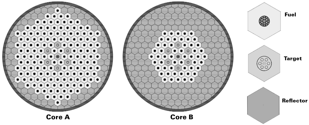 شش گوشهای سفید با با دایرههای سیاه در مرکز، کانال هایی هستند که میلههای سوخت در آنها قرار میگیرند. شش گوشهای خاکستری مکان هایی هستند که آب سنگین نگه داری میشود که به عنوان منعکس کننده نوترونی عمل میکند تا