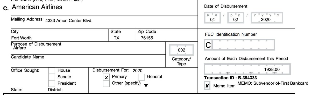 4/2/20 $1,928 American Airlines for "Airfare"