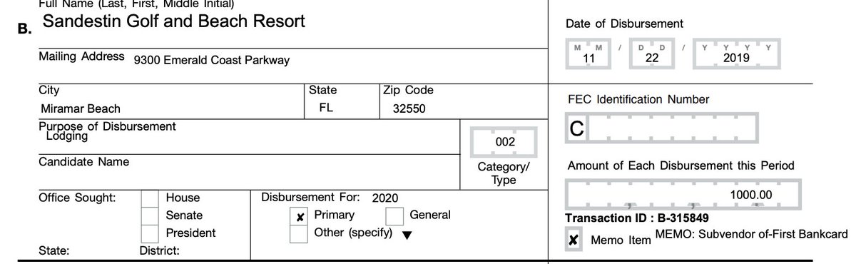 11/20/2019 Sandestin Golf & Beach Resort $4,151.49-this is noted as being a "lodging" expense. Room rates run around $339 a night. So who was this for? Was he there for a while? Did he pay for a bunch of rooms?