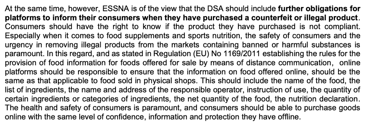 4/ The European Specialist Sports Nutrition Alliance @ESSNAsports supports the Know Your Business Customer principle but wants platforms to do more to inform users of fraud. Also wants to know how #DSA will interact with Official Controls Regulation (OCR):