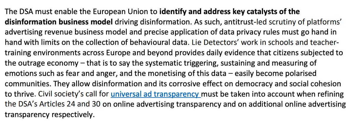 11/ Media literacy organisation @LieDetectorsOrg wants limits on the collection of behavioural data and more transparency on how that data is used to influence users' emotions. They also want more transparency on corporate patronage & sponsorship:
