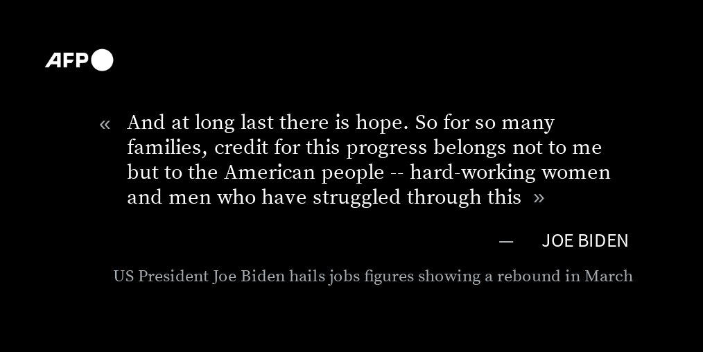 #UPDATE US President Joe Biden hails new jobs figures showing a massive rebound in March as a sign of hope "at long last" for the recovery of an economy devastated by the pandemic