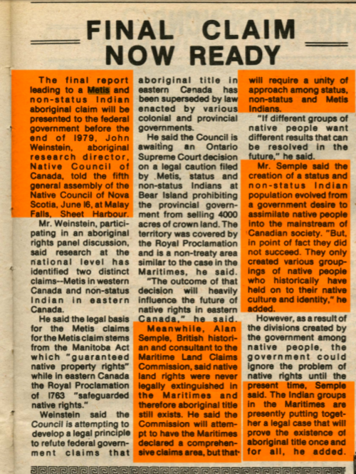 Final land claim now ready - Micmac News 1979 07 - NCNS. (Notice the date, 1979, in 1980 the chiefs changed the constitution to remove Metis and make sure they had no voice, say they had no identity, and now say they never existed, period, good luck wiping out only 40 some years