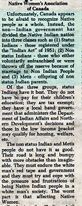 Mal i Mic News Oct 1976-What Is a NonStatus Indian- when a Status women married nonIndian-she loses her Indian Status- descendants lose their Status-most of their descendants are known as Metis.