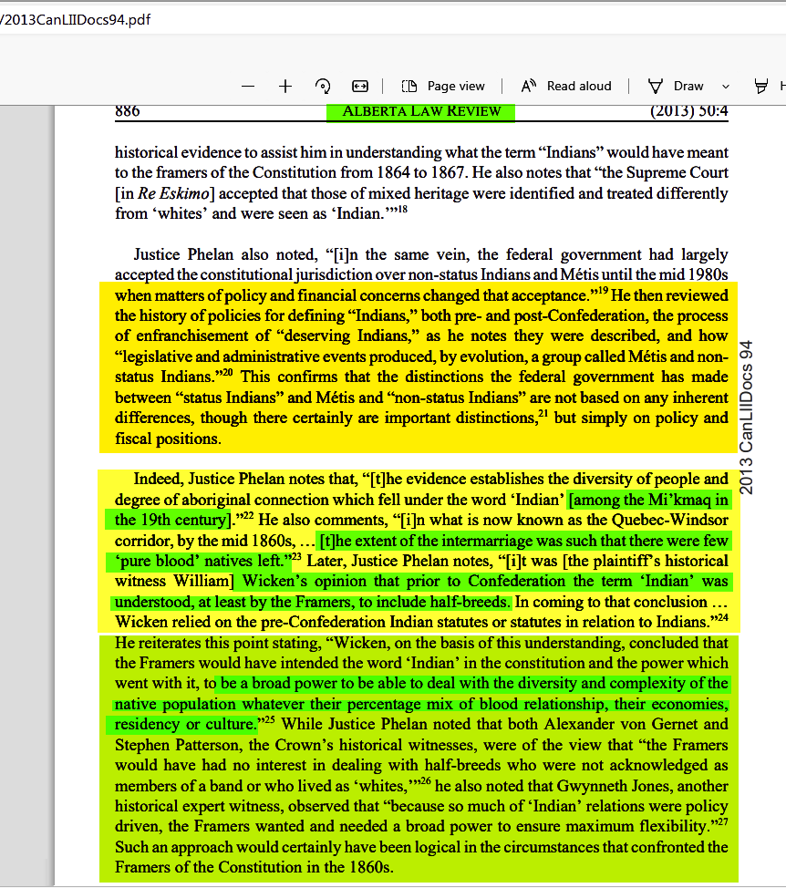 DANIELS V. CANADA-THE INEVITABLE COMES TO PASS, AT LAST- IAN PEACH AND AARON MINTZ - 2013CanLiiDocs94 - Among the Mi'kmaq in the 19th century, the extent of intermarriage was such that there were few "pure blood" natives left, the term Indian prior to confederation included