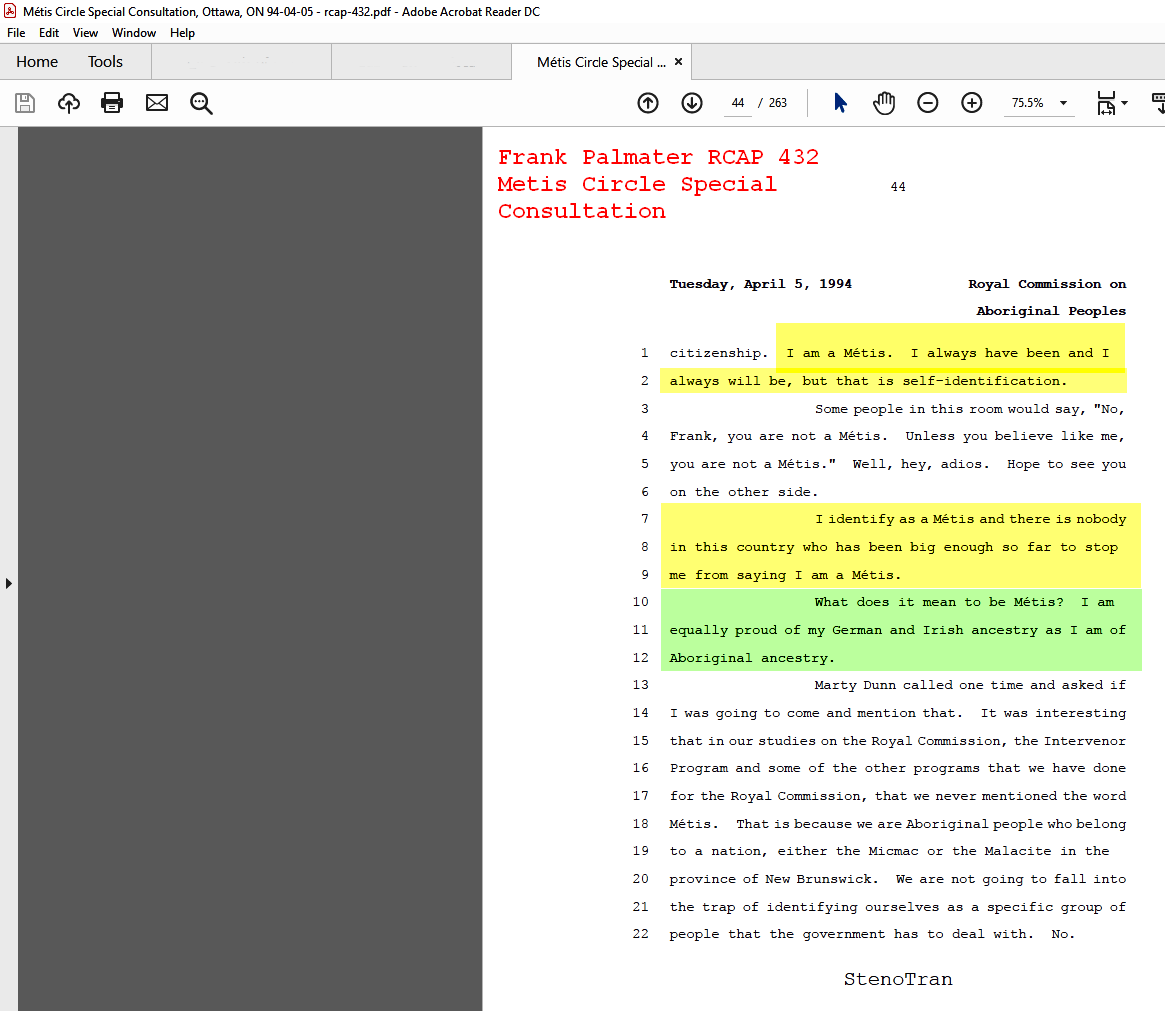 Metis identity. Frank Palmater in the RCAP reports, 432 Metis Circle Special Consultation, self identifies as a Mi'kmaw Metis from the Maritimes and now she has has regained her status and she is now recognized by her nation, has a community now and a law degree and NOW says