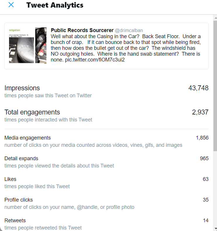 Well what about the Casing in the Car? Back Seat Floor. Under a bunch of crap. If it can bounce back to that spot while being fired, then how does the bullet get out of the car? The windshield has NO outgoing holes. Where is the hand swab statement? There is none.