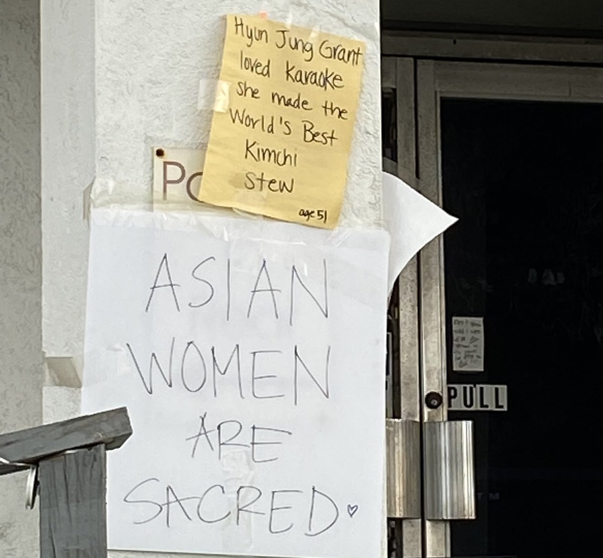 PROVIDER: Every time my mom comes over she has a large cooler full of food even when I tell her I don’t need anything. Fruits kimchi marinated KoreanBBQ. I thought about this when I saw this sign at shooting site saying one of victims, Hyun Jung Grant, made best kimchi stew. 7/11