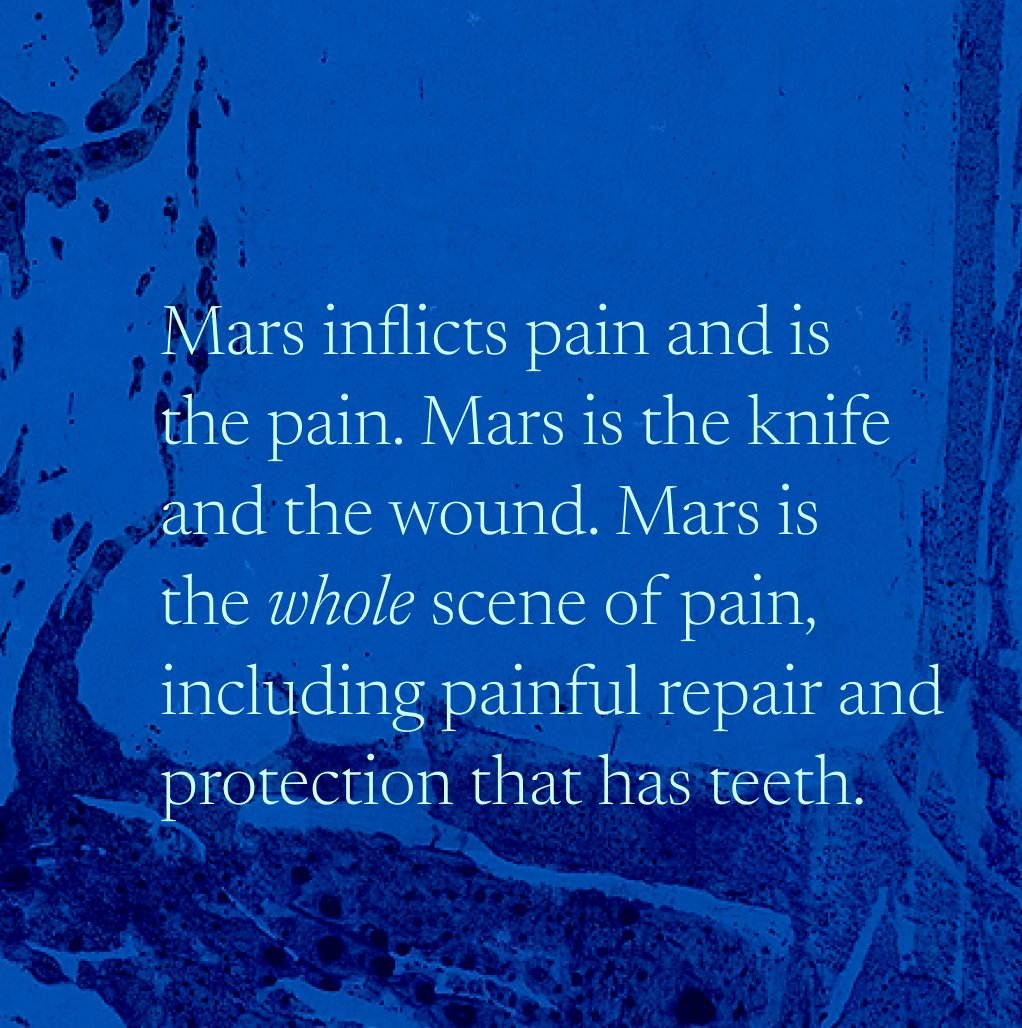 Mars inflicts pain and is the pain. Mars is the knife and the wound. Mars is the *whole* scene of pain, including painful repair and protection that has teeth.
