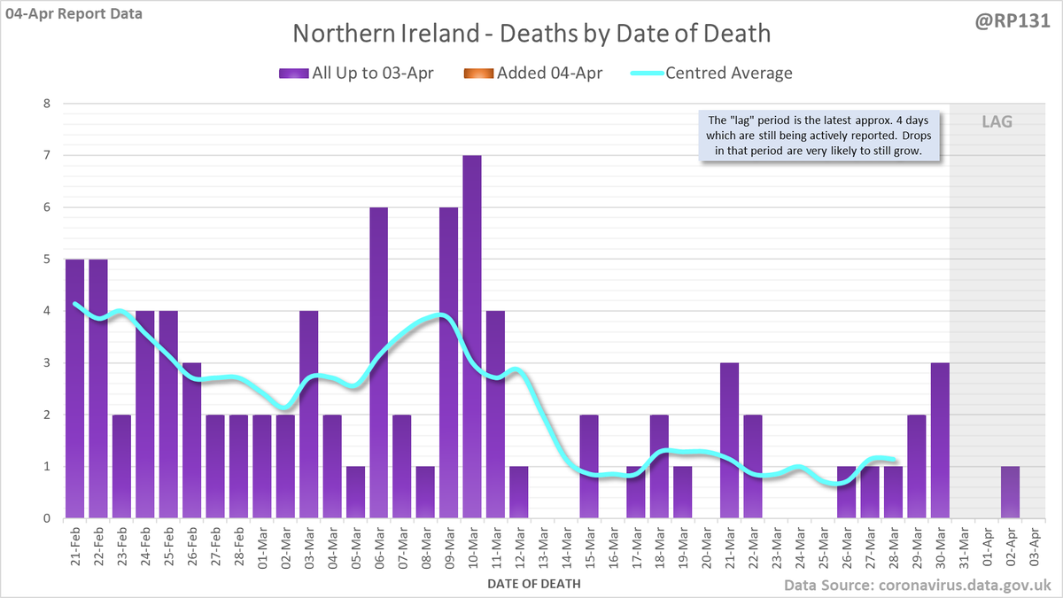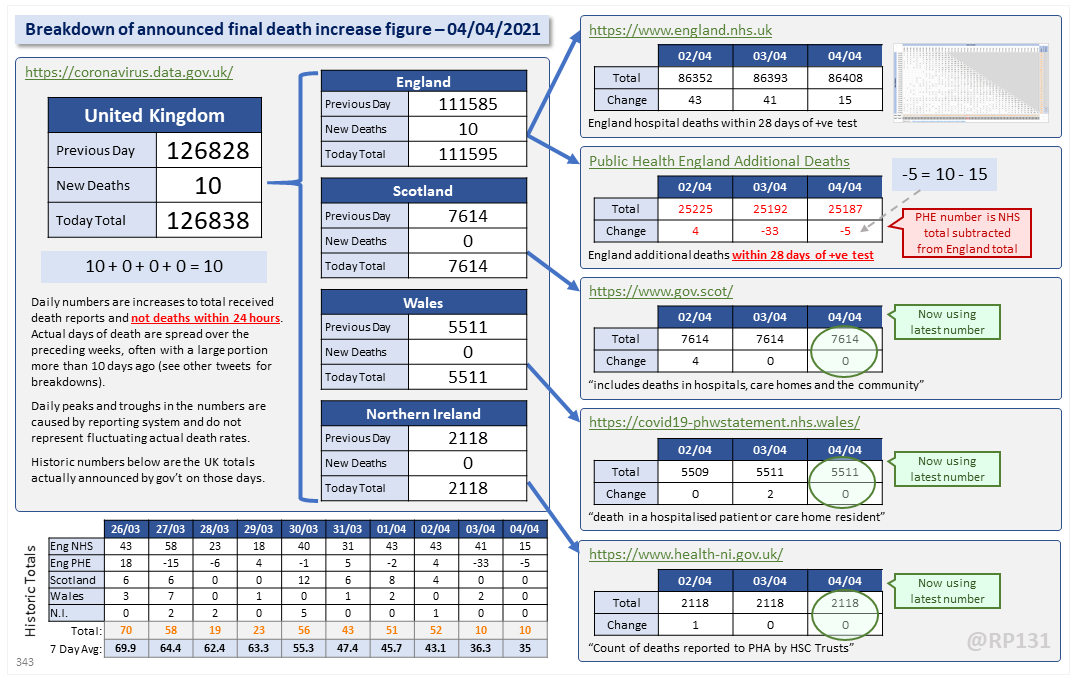 Dashboard for 04-Apr to explain where the #covid19uk total death increase figure of 10 actually comes from. The PHE dataset merge resulted in a net removal of 5 additional deaths today (hence the -5). This brings the 7 day rolling average DOWN by 1.3 to 35.