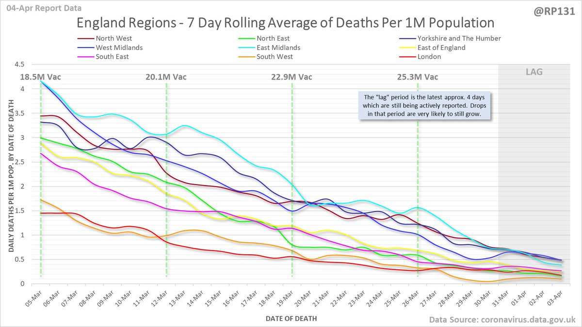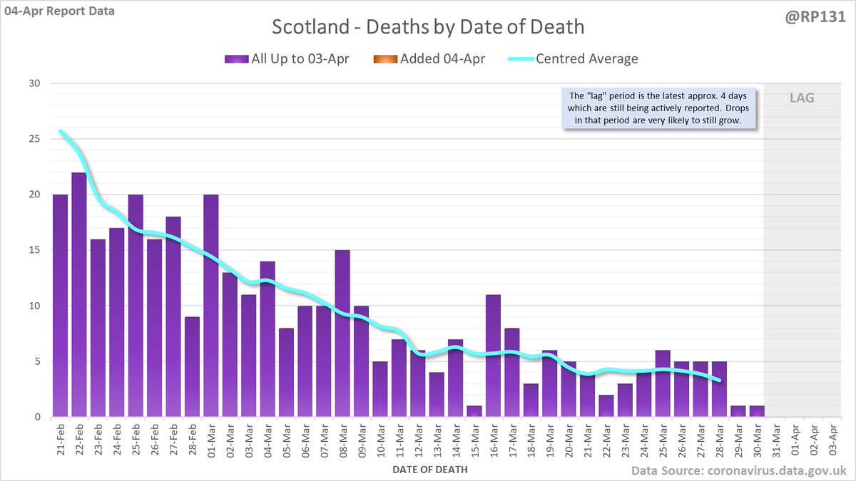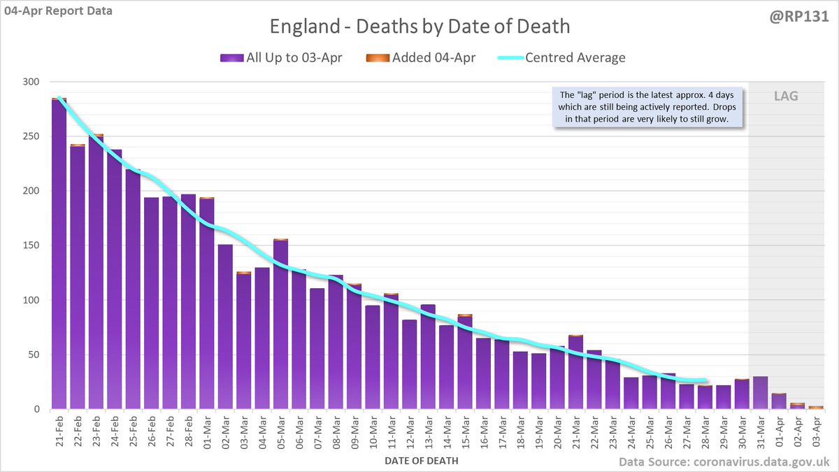 10 new #covid19uk deaths reported today (04-Apr). This brings the rolling average by date of death (allowing 4 days for lag) to 32 - which is a reduction of 45% in the last week and the lowest since 20-Sep (i.e. 189 days ago).