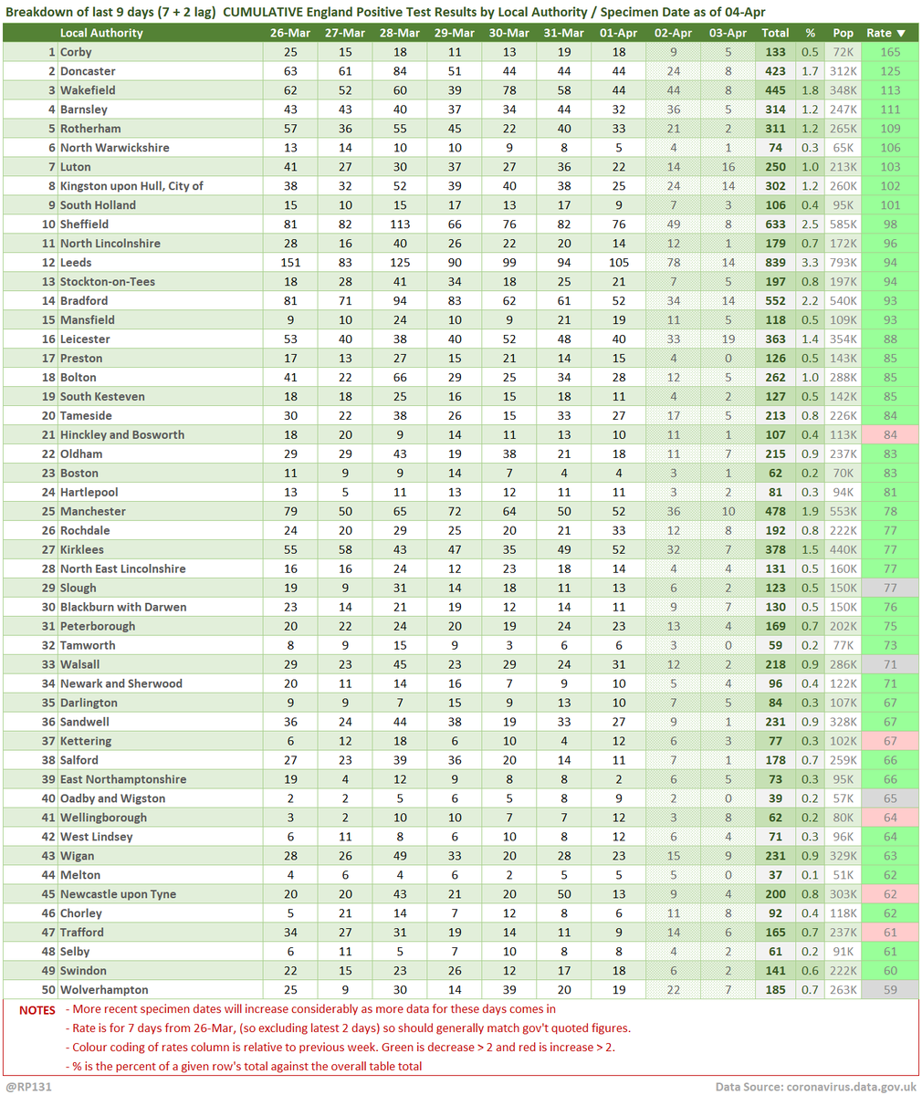 #covid19uk - Tables thread. Re-ordered now to put the more popular rate sorted table at the top. So this is top 50 England Local Authorities by positives per 100K population in last 7 days, up to 3 days ago. Bright green means lower than previous period.