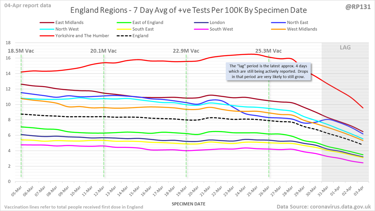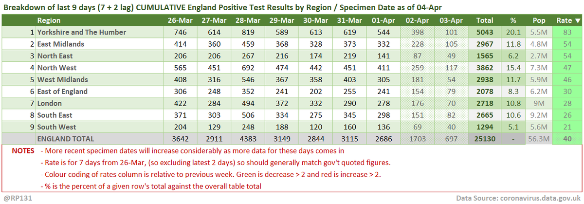 #covid19uk - Detailed positive tests thread. The majority of this thread is a set of views of rolling 7 day average positives per 100K by specimen date. Starting with England regions: