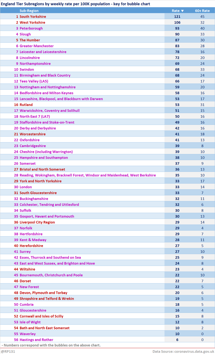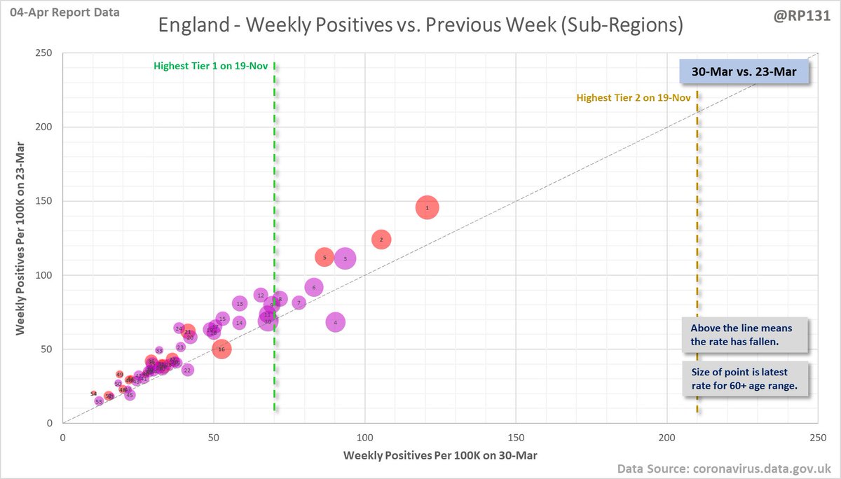 Bubble chart (Tiers / Sub-region) thread. This type of chart allows us to compare week on week changes by seeing if the points are above or below the dotted line. This version is grouped by "sub-regions" as were previously used for assigning tiers: