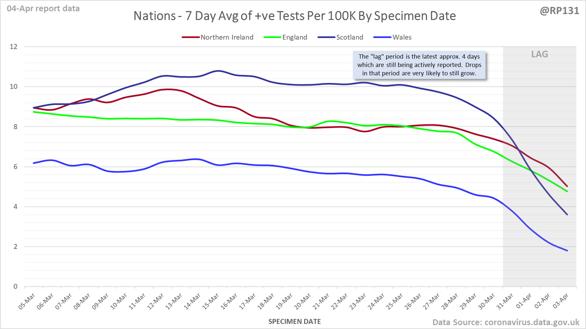 Date of death chart for UK nations drawn with 7 day rolling averages of deaths per 1M population.