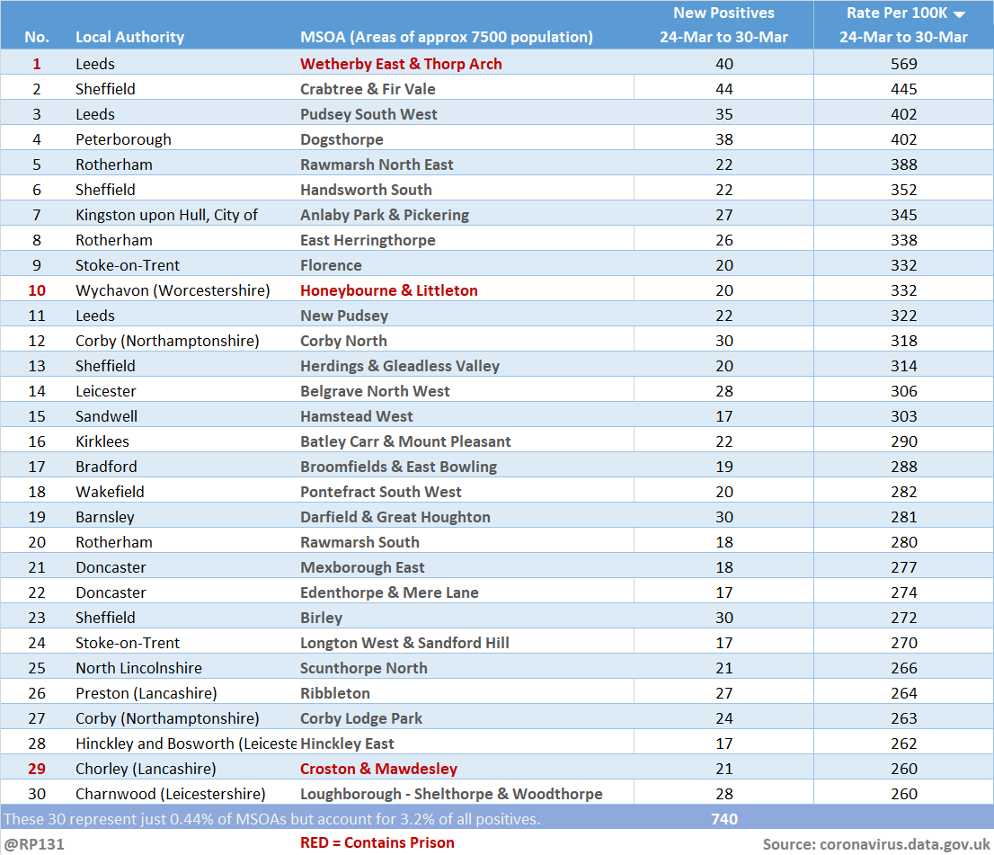 Updated table of top 30 MSOAs (by rate) based on latest numbers in today's report.