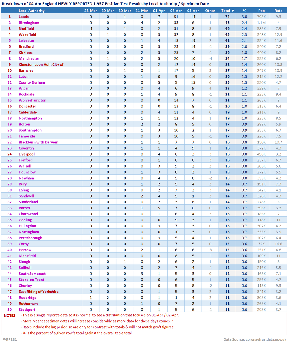Table view of today's 1,957 NEWLY REPORTED England positive test results by local authority and recent specimen dates. Here showing top 50 authorities which represent 48% of the population, but have 73% of the positives.