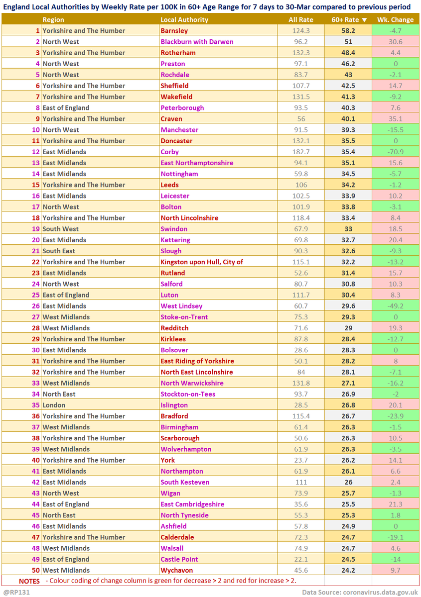 Top 50 table view of latest availble Local Authority data for the 60+ age range for 7 days to 30-Mar sorted by descending rate per 100K population (of that age range). Change column is compared to previous week with red for increase and green for decrease.