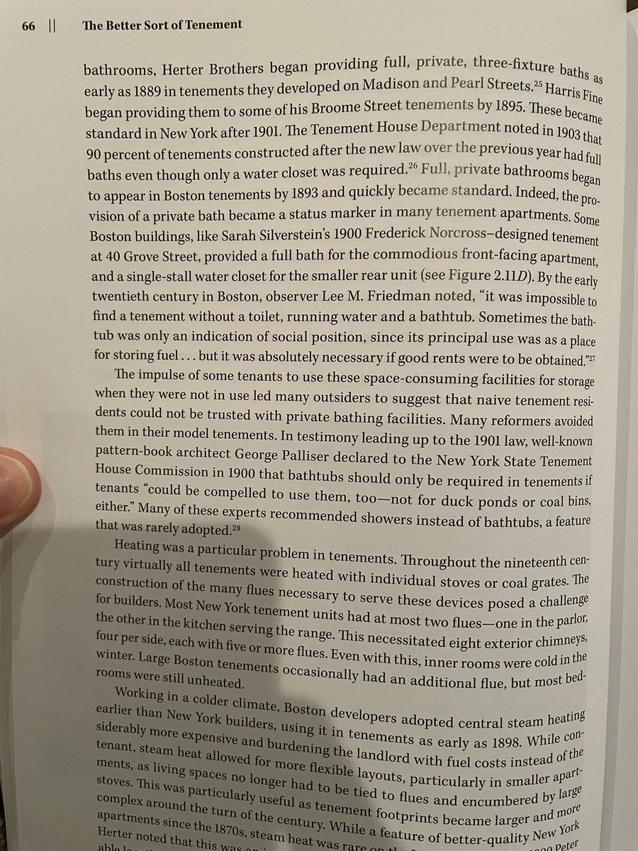 This book is so good...better than Plunz’s A History of Housing in NYC. Better story arc, not as encyclopedic. Really gets into the head of an immigrant tenant...you can imagine yourself upgrading to an apt with a private toilet, hot water heater & hall entrance for your boarder