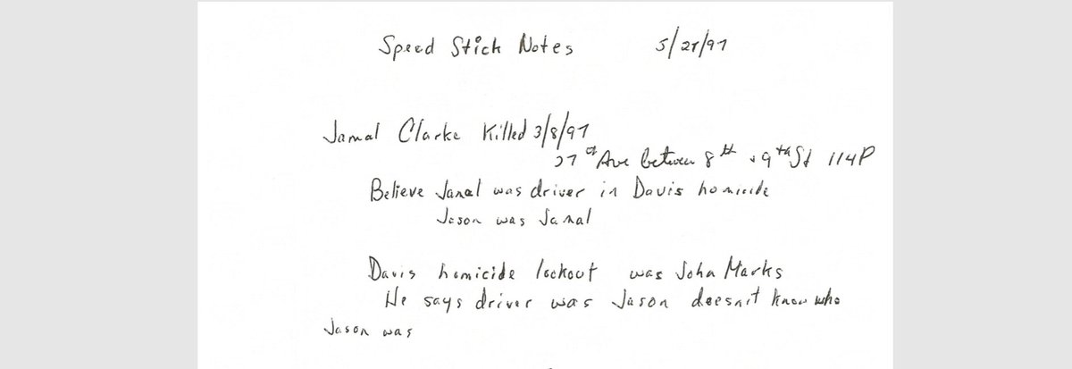 19/ Charles Testagrossa himself, the man who would later prosecute Bell, debriefed a detective who detailed the Speed Stick gang’s potential role in the check-cashing store murders. He took his own his handwritten notes about that conversation, entitled “Speed Stick Notes."