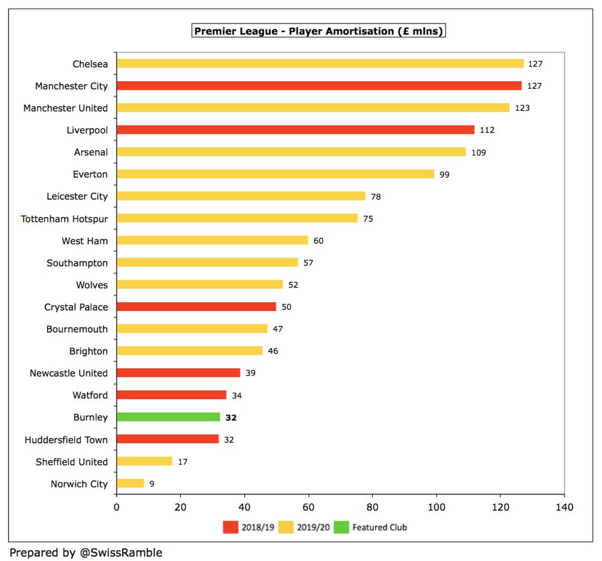 #BurnleyFC player amortisation, the annual charge to expense transfer fees over a player’s contract, fell £5m (14%) to £32m following player departures. Reinforced their position as one of the lowest in the Premier League, only ahead of promoted clubs #SUFC and #NCFC in 2019/20.