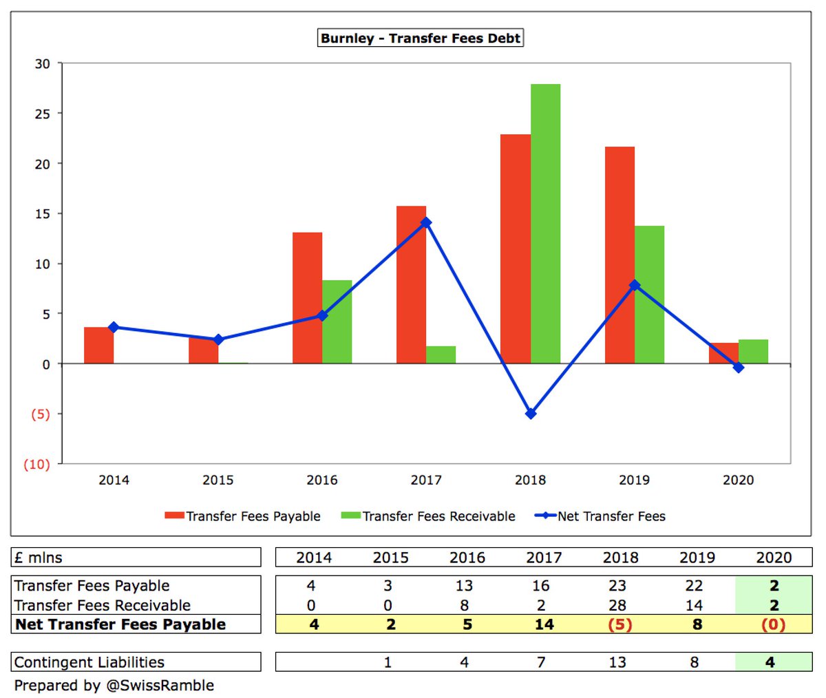 #BurnleyFC also managed to cut transfer debt from £22m to just £2m. In fact, the net amount is also zero, as £2m transfer fees are owed to them by other clubs. By far the lowest in the Premier League, e.g. #AFC owe £154m. Contingent liabilities only £4m.