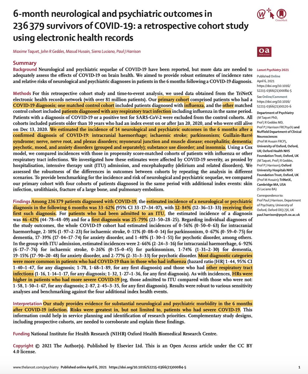 Analysis of health records of 236,379 #COVID19 survivors: 34% diagnosed with neurological or psychiatric illnesses w/in 6 months, significantly more than in comparator groups of patients with flu or other respiratory infections over the same time period. thelancet.com/action/showPdf…
