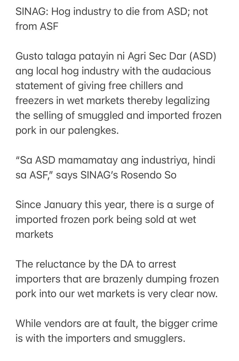 @meltlopez Agri group SINAG says DA Sec. Dar’s policies will kill the local hog raising industry.