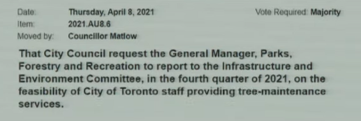 Coun. Matlow motion asking staff to look at having tree maintenance done by city staff rather than contracted crews