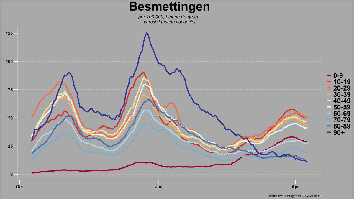 Verschil nieuwe gevallen tussen verschillende leeftijdsgroepen.