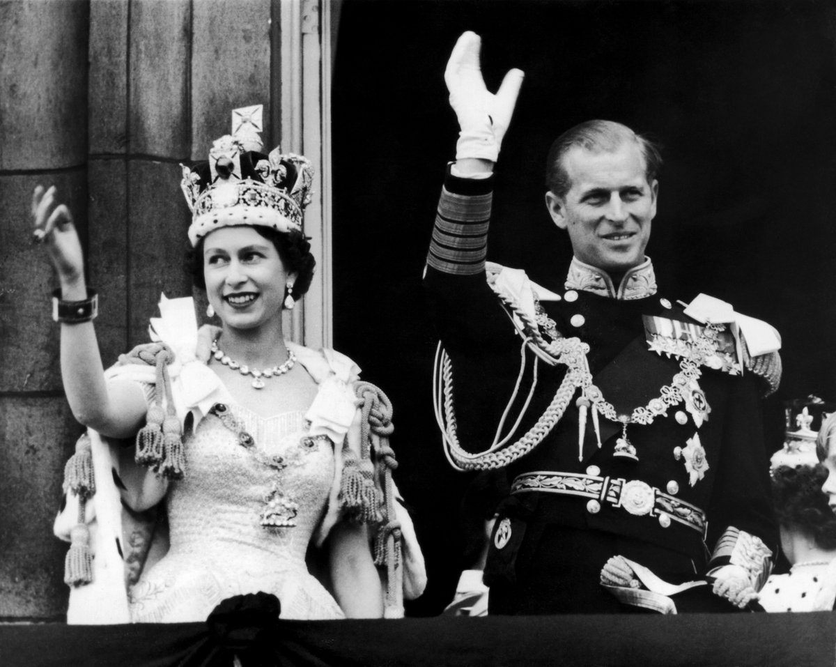 Queen Elizabeth II and Prince Philip waves to the crowd on June 2, 1953, after she was crowned at Westminster Abbey in London.