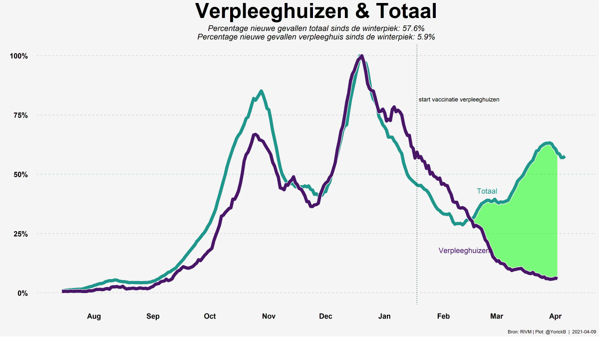 De bewoners van verpleeghuizen zijn goed beschermt, maar nog niet iedereen heeft een prik gekregen. Hierdoor is er zijn er nog wel mensen die besmet worden; maar het is véél minder dan in de rest van de bevolking, en de (niet-) mobile thuiswonenden.
