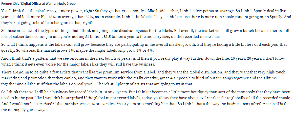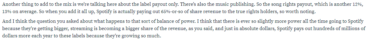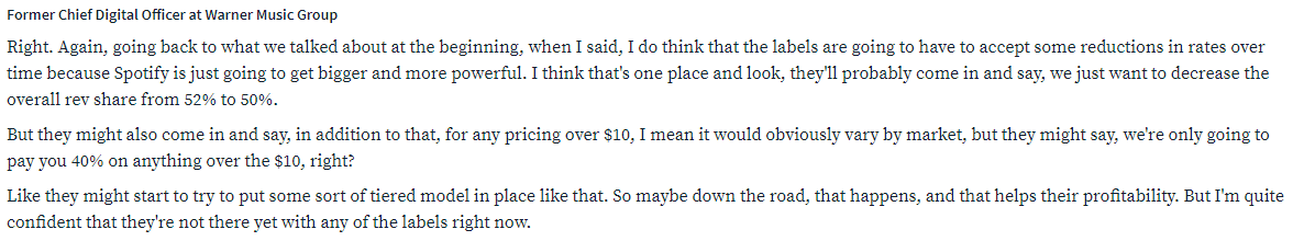 8/ Recent v helpful Tegus call with ex Chief of Digital Music Rights at Warner Music Group reminds that Spotify currently pays away 65% of every $1 in revenue; 52% to the label and 12-13% to the song rights owner. Some extracts: