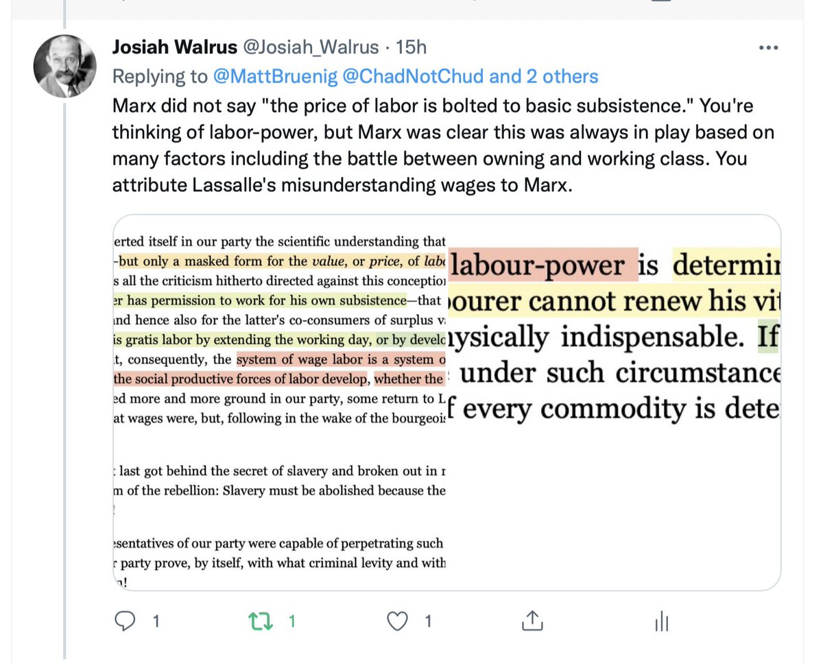 Matt Bruenig doesn't understand the distinction between what Marx wrote about the price of simple-labour-power and how wages are actually determined. Since his tweets are auto-deleted ever so often I supply the screenshots in the thread below.