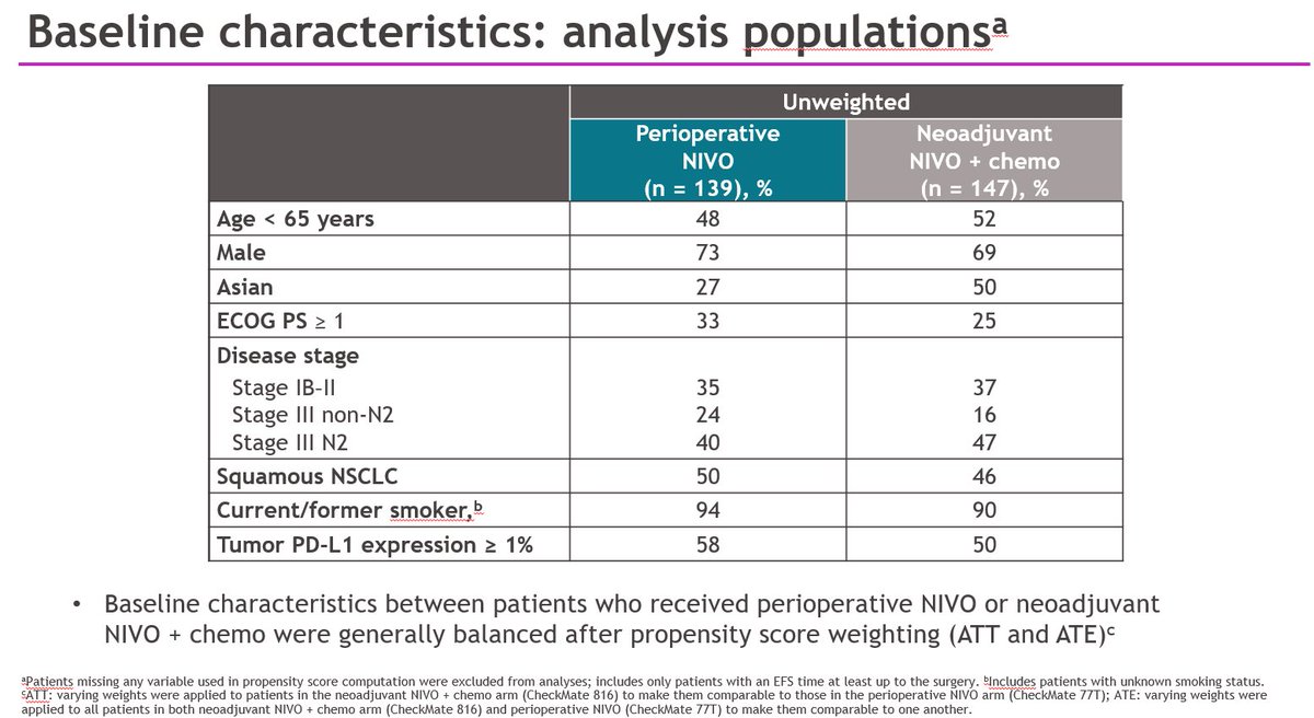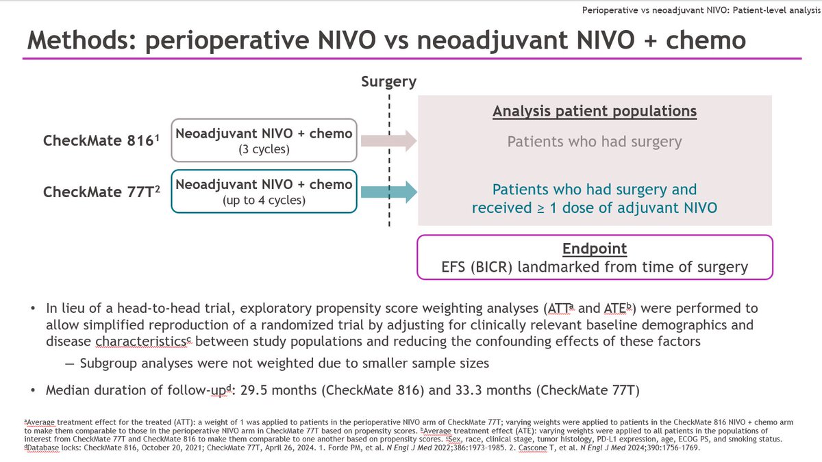 Using 2 propensity score weighting methods, individual pts from #CM816 & #CM77T were matched for key clinical characteristics and a landmark event-free survival analysis from definitive surgery was performed 3/
