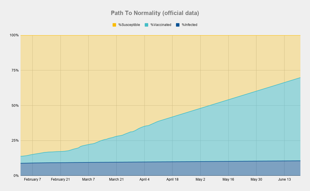 Using the official data, at our current vaccination pace, we would reach "herd immunity" in June.