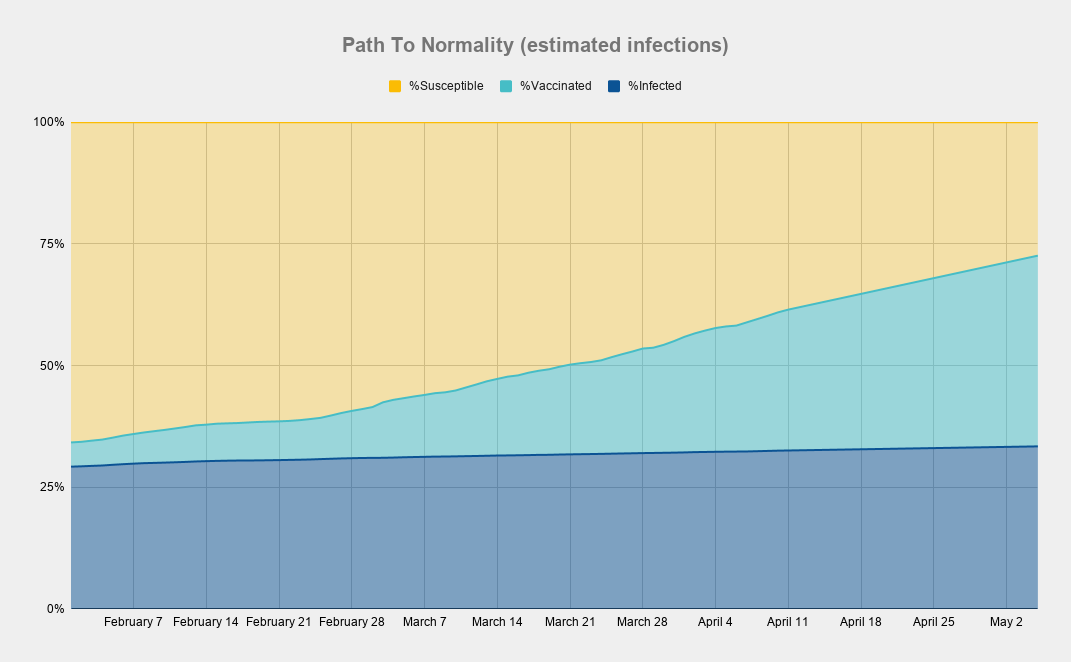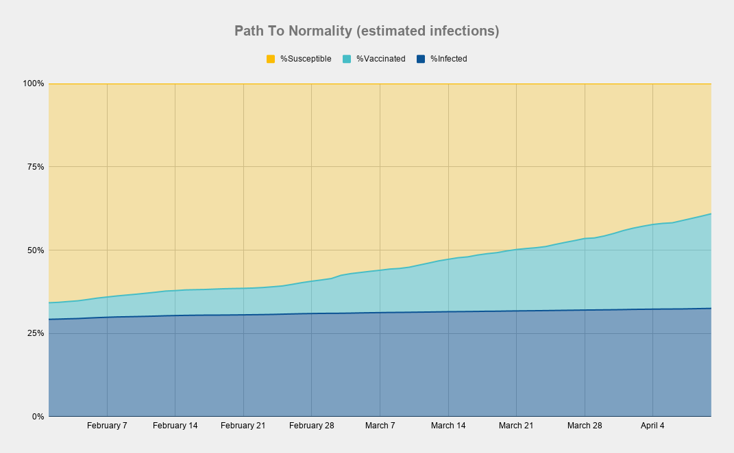 Using estimated infections, at our current rate of vaccination, we would reach "herd immunity" within the next month.