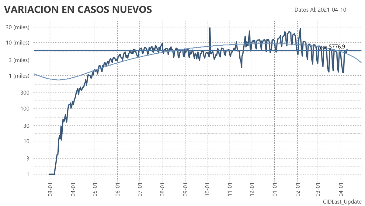 Cerramos la semana 14 del año con un ligero aumento contra la semana anterior en cuanto a casos nuevos. Si observamos la gráfica diaria es claro que el aumento se debe a los casos del ajuste del día de ayer.