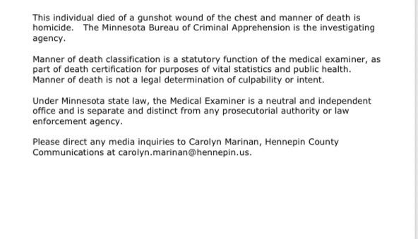 Report from the Hennepin County Medical Examiner says 20-year-old #DaunteWright died from a gunshot wound to the chest. Says the manner of death is a homicide @kare11