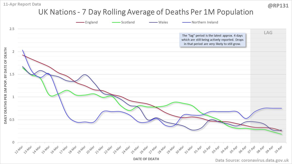 Date of death chart for UK nations drawn with 7 day rolling averages of deaths per 1M population.