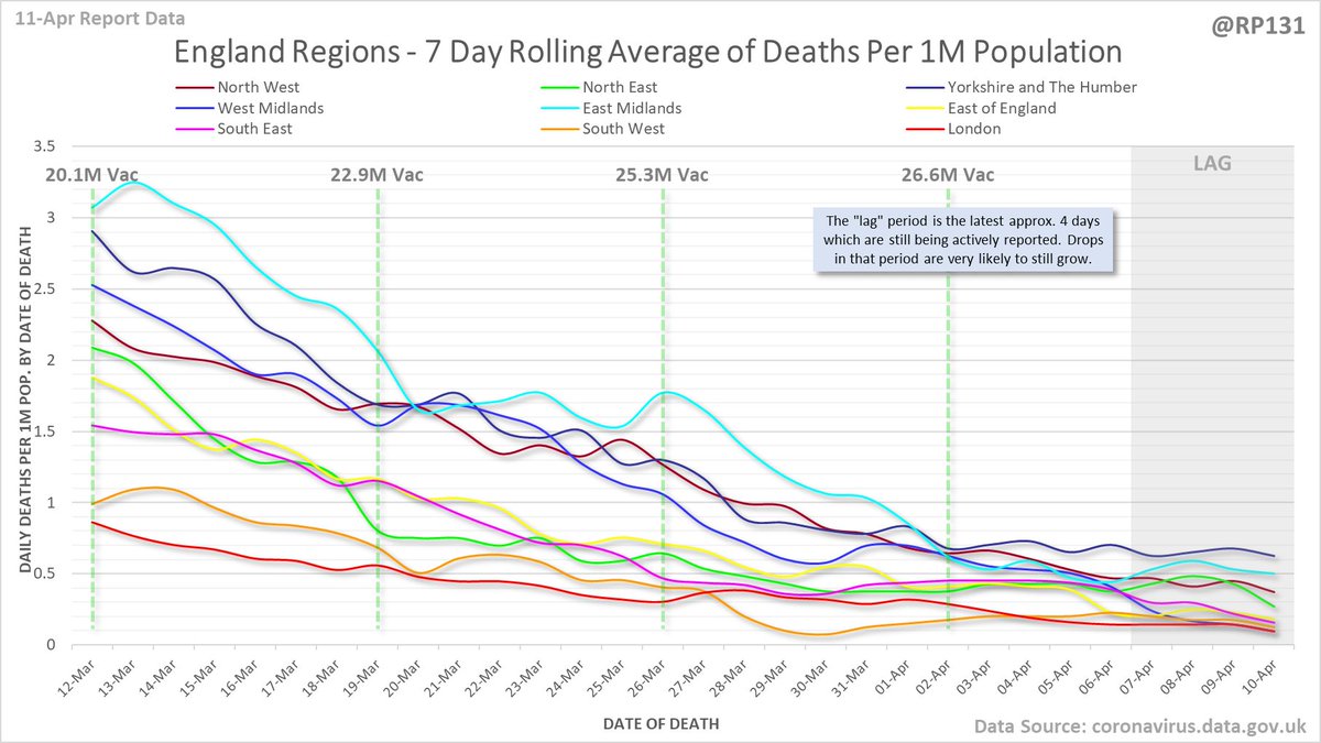 Date of death chart for England regions drawn with 7 day rolling averages of deaths per 1M population.