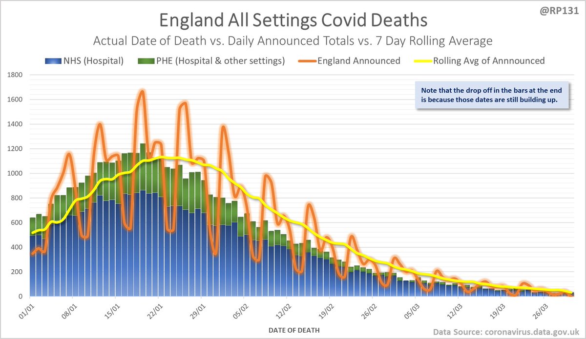England date-of-death vs. announcement chart. Note that the numbers drop at the end as data is still being actively reported for those dates.