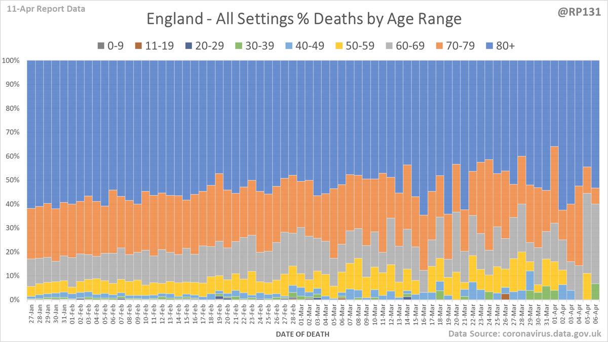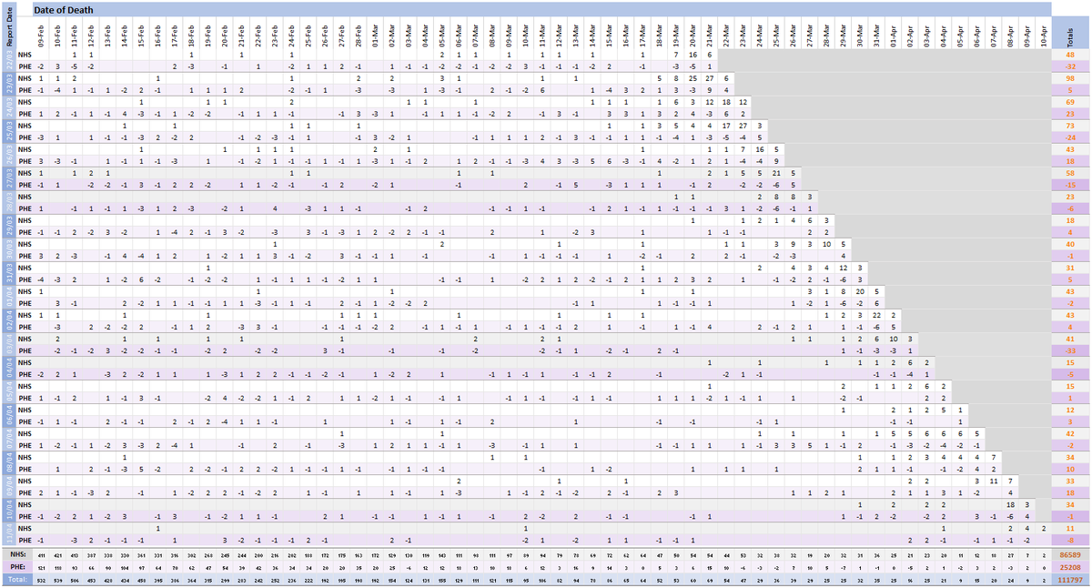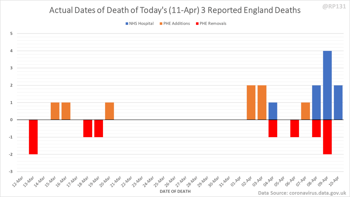 Pivot for 11-Apr to show breakdown of both 11 NHS and -8 (net) PHE deaths by date of death. The negatives are a combination of date of death corrections and accounting for NHS deaths that were already known to PHE. Small version for twitter first: