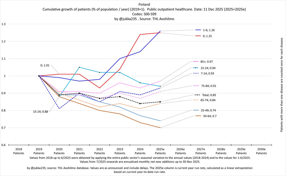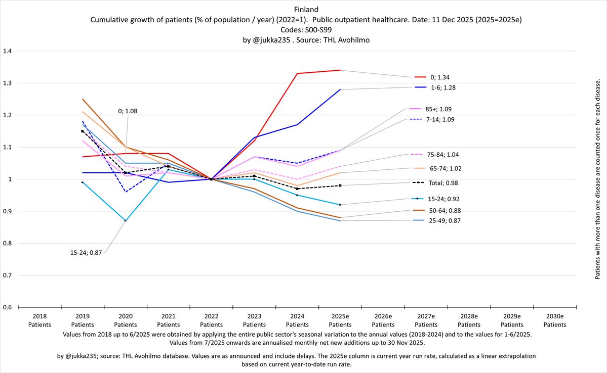 After 2022, 1-6 year olds have overtaken a total of three other age groups (50-64, 15-24 and 65-74 year olds), and are now clearly above the total population average. All injuries (S00-S99). 3/x