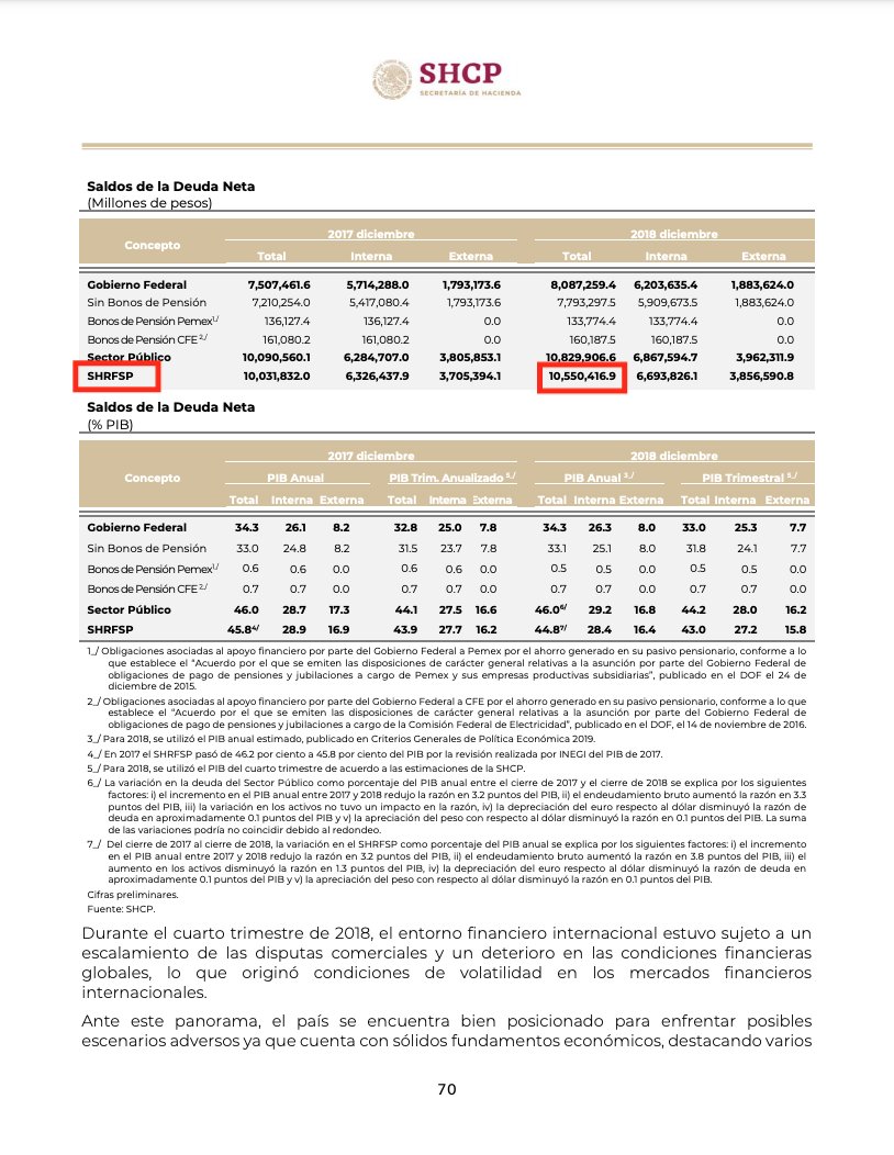 A finales de 2018, el Saldo Histórico de los Requerimientos Financieros del Sector Público (SHRFSP) en México era de 10.5 billones de pesos.