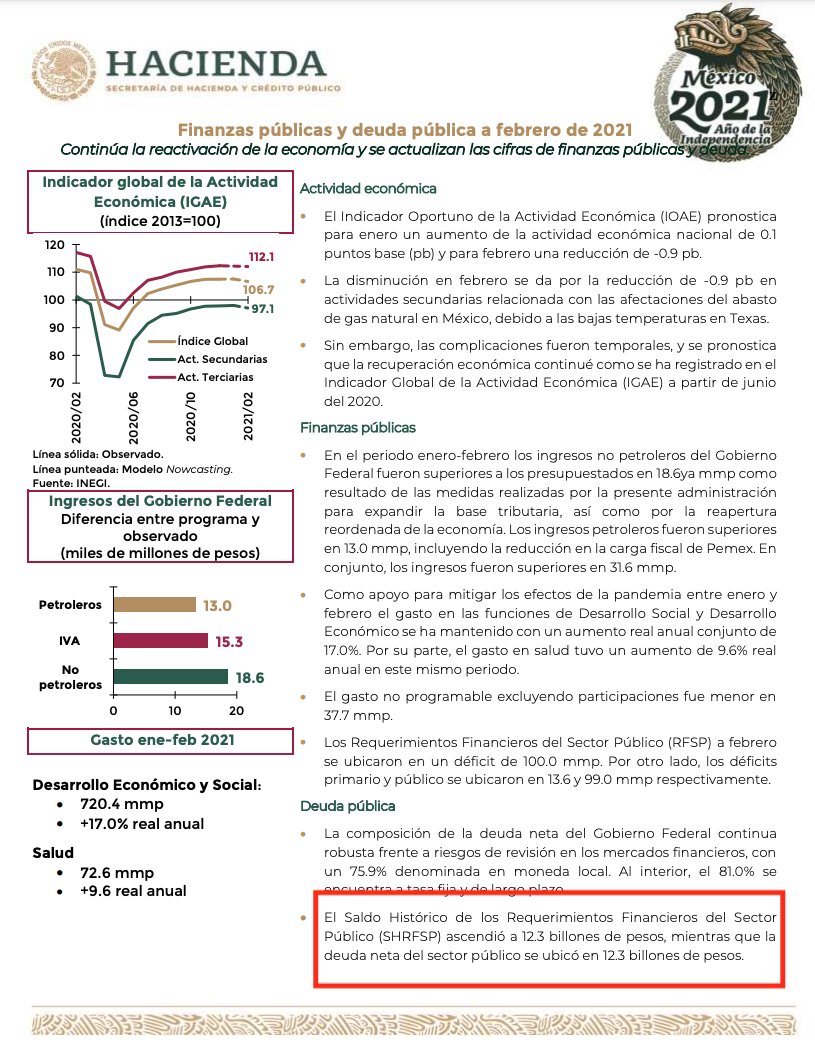 Esto significa que la deuda pública en México creció 1.8 billones de pesos de diciembre de 2018 a febrero de 2021.